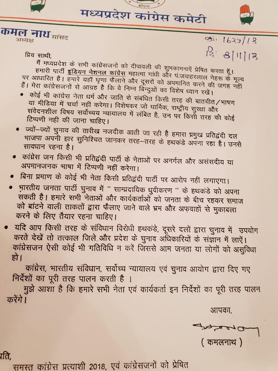 कमलनाथ ने अपनी चिट्ठी के जरिए उस स्वच्छ और पवित्र राजनीति को आत्मसात करने की अपील की है, जो आज के दौर में विलुप्त हो चुकी है। नाथ ने कहा है कि कांग्रेस में घृणा फैलाने और दूसरों को अपमानित करने की जगह नहीं है। उन्होंने पार्टीजनों से चुनाव के दौरान छह बिंदुओं पर सतर्कता बरतने को कहा है। ये बिंदु हैं-